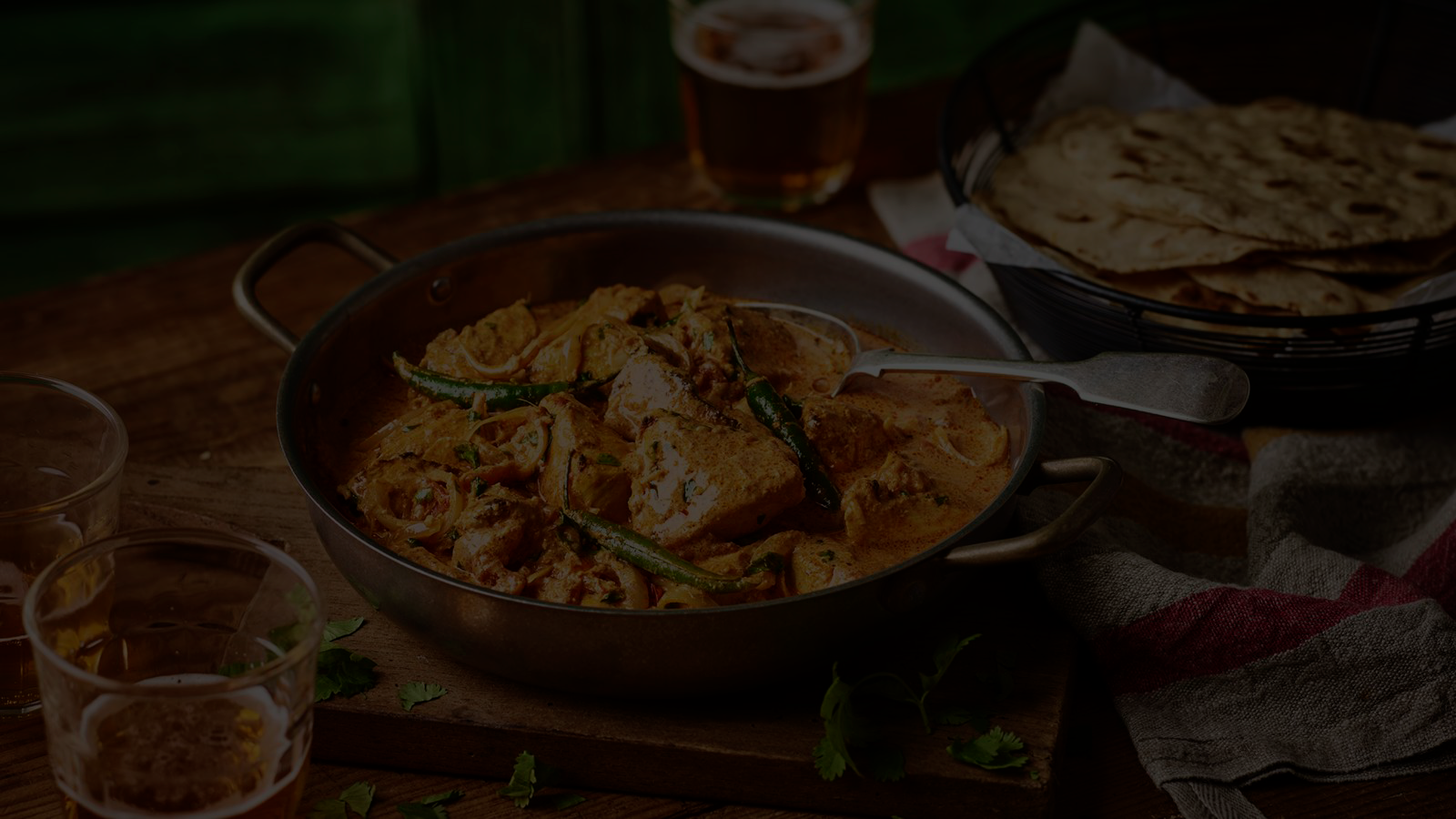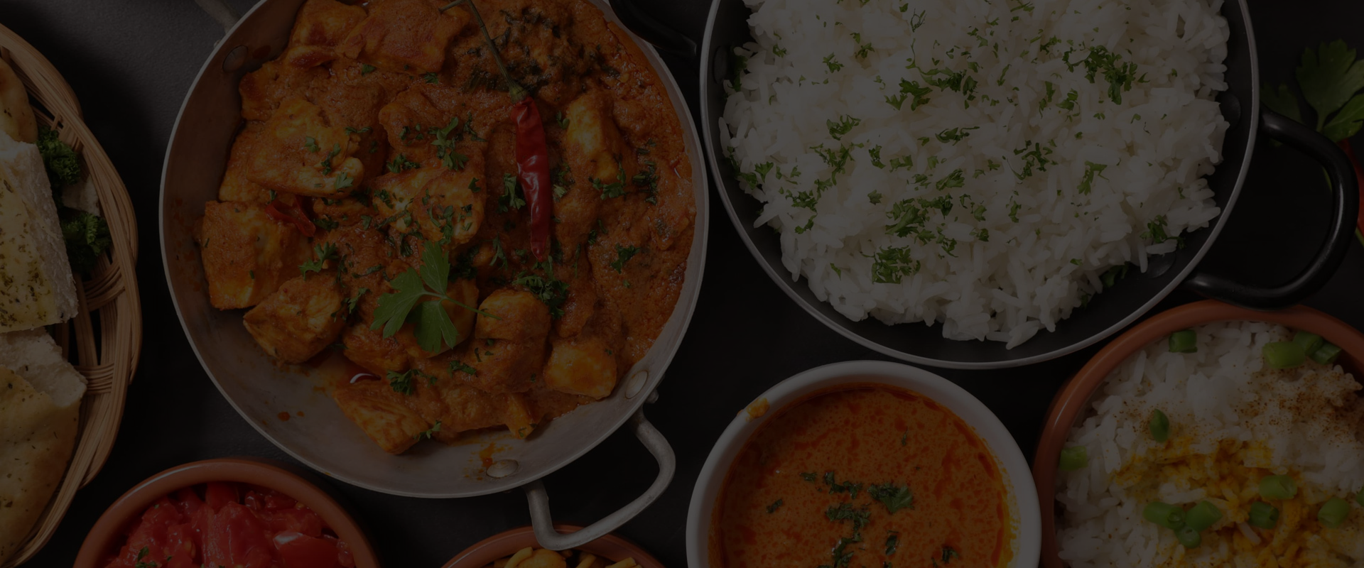 Chicken Tikka Masala, Butter Chicken, Korma, Madras, Vindaloo, Mango & Pineapple, Jalfrezi και Punjabi rooster.
